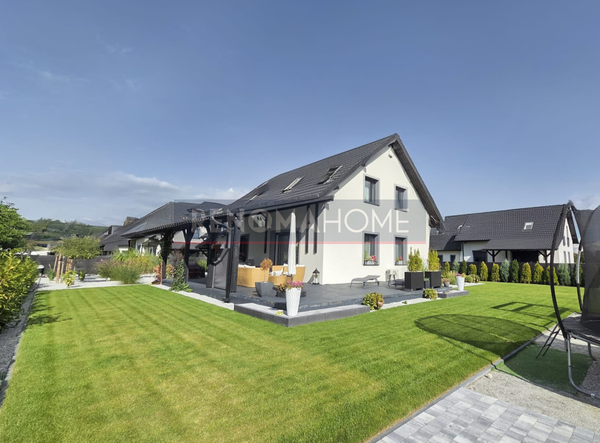 Ogród został starannie zaprojektowany - nawodnienie automatyczne, trawa z rolki, liczne nasadzenia, plac zabaw dla dzieci, a także miejsce przygotowane pod basen lub palenisko.
