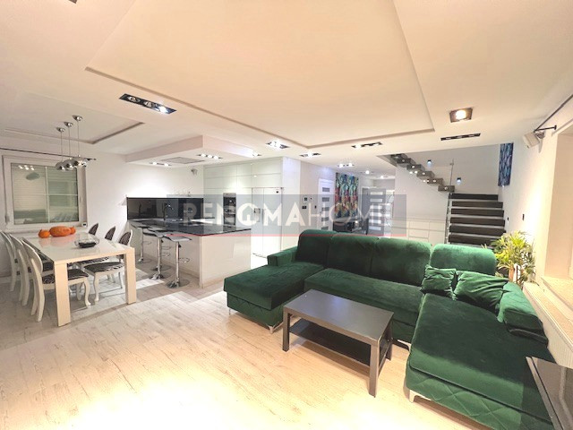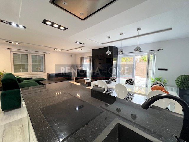 Serce domu stanowi przepiękny, przestronny salon z jadalnią, w którym dominuje światło i elegancja.
