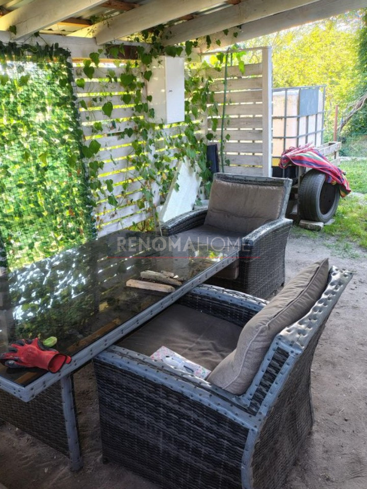 - Przed domkiem znajduje się zadaszony taras wyposażony w meble ogrodowe. Całość tworzy funkcjonalną i komfortową przestrzeń do wypoczynku.