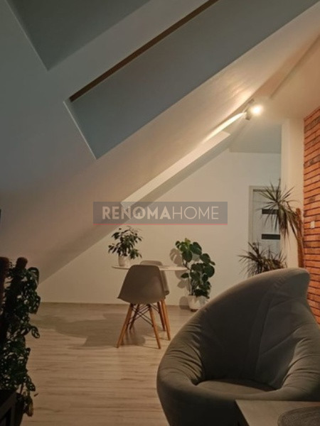 Lokal znajduje się na poddaszu, co nadaje mu wyjątkowego charakteru. Skosy sprawiają, że mieszkanie jest odczuwalnie większe - powierzchnia po podłodze wynosi ok. 55 m², a wnętrze jest przytulne i pełne naturalnego światła.
