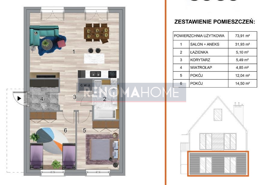 Mieszkanie o łącznej powierzchni 73,91m2 usytuowane na parterze z dużym ogrodem 150m2: