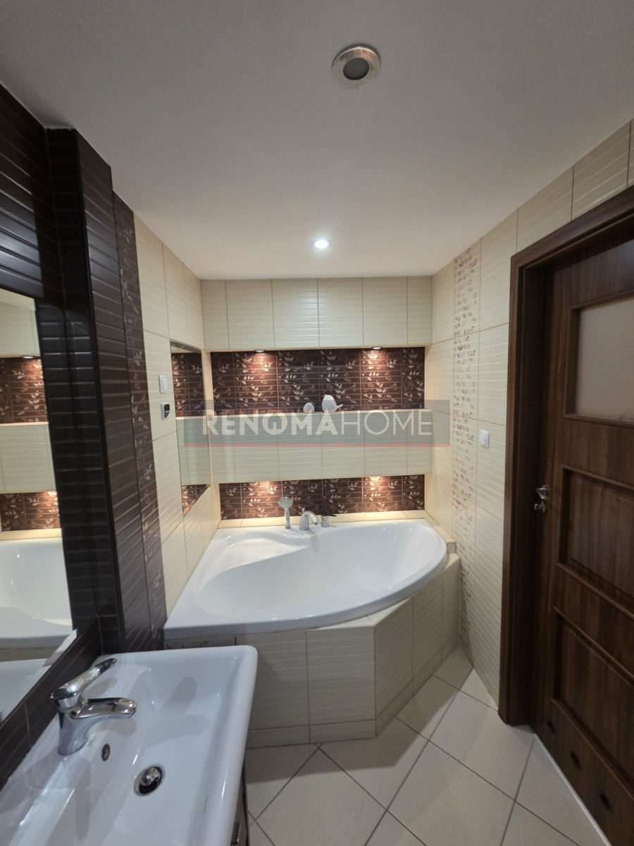- W łazience- glazura na podłodze i na ścianach położona całościowo, wanna, pralka- dekoracyjne oświetlenia,