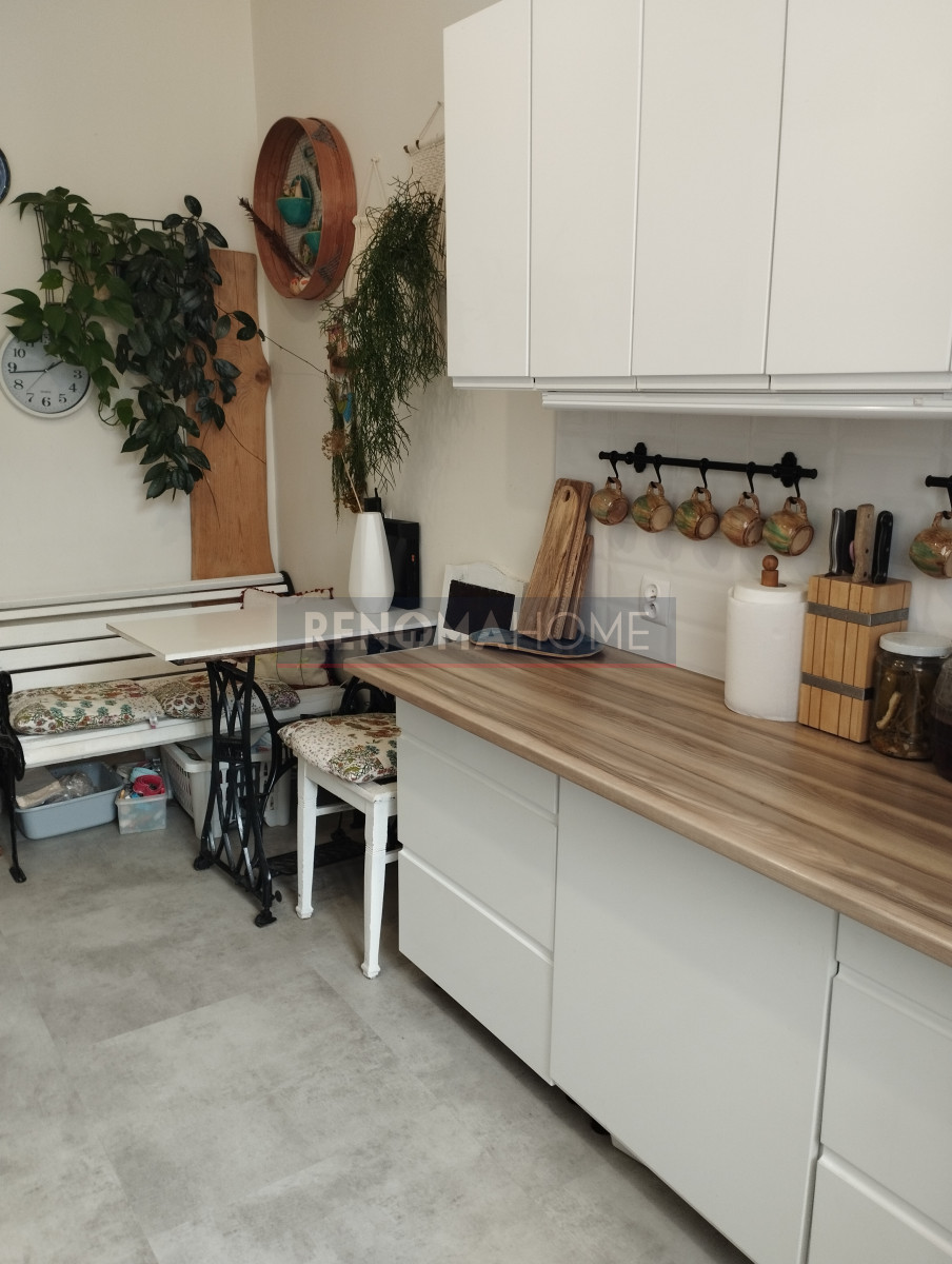 W kuchni na podłodze panele winylowe- meble ze sprzętem AGD - kuchenka gazowa piekarnik, lodówka, zmywarka, pralka, okap - pozostają w cenie mieszkania.