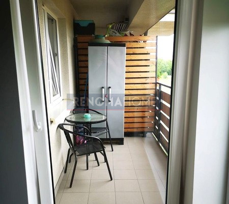 - Balkon (loggia) z dodatkową szafą i zestawem wypoczynkowym.