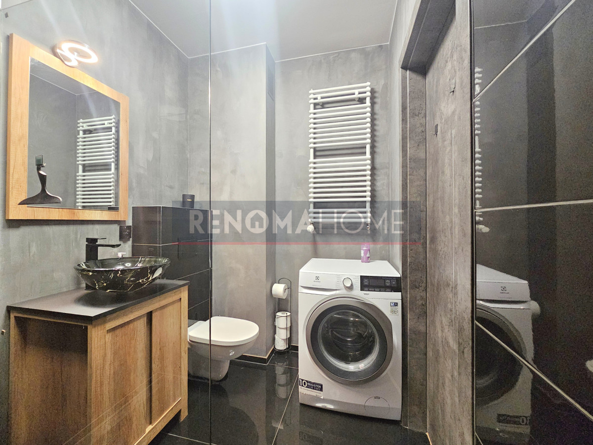 W łazience znajduje się prysznic i pralka.