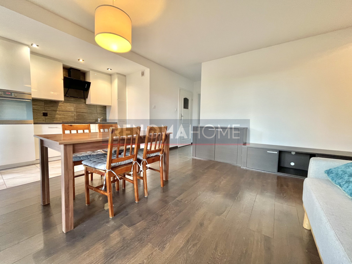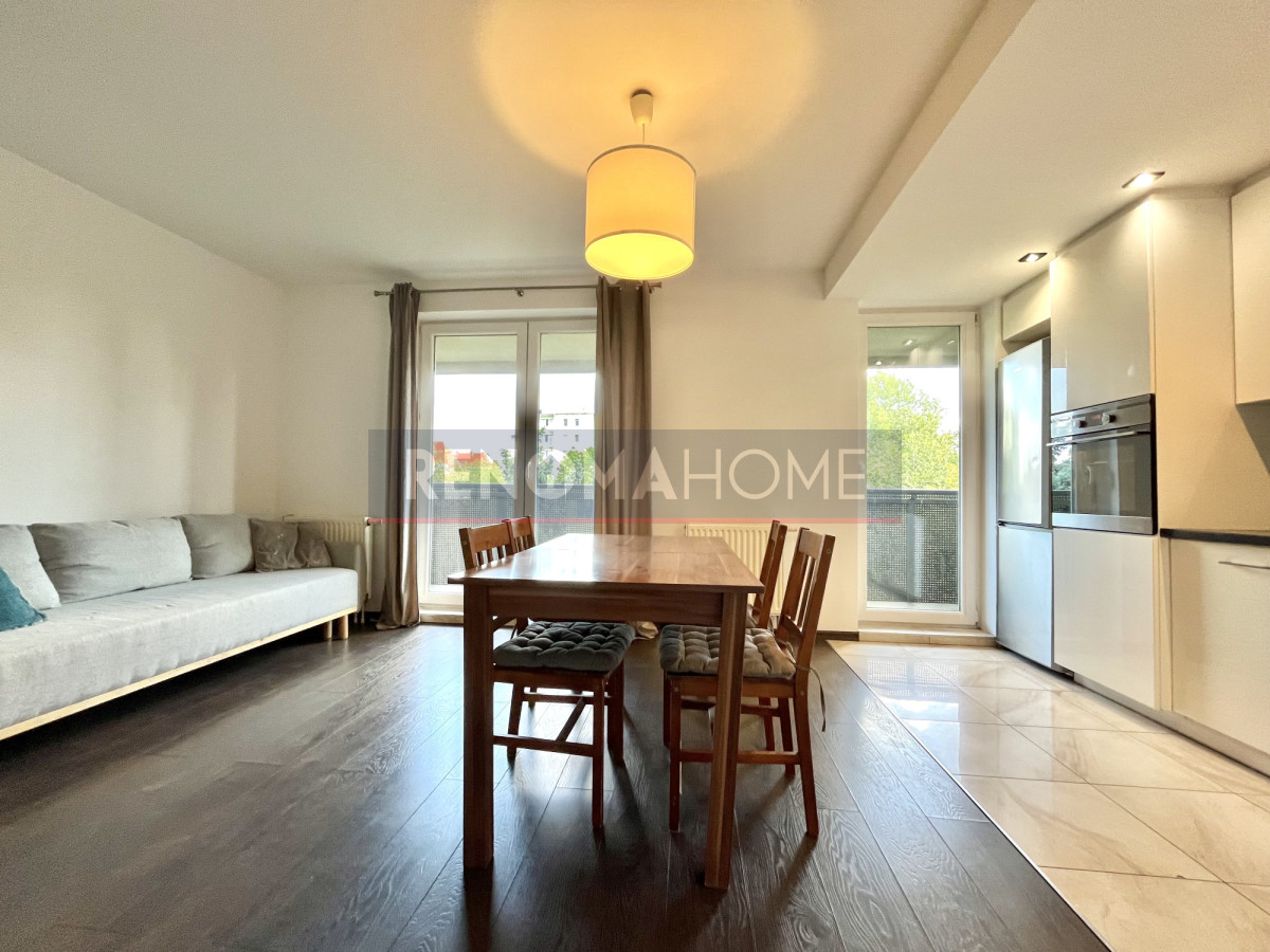 Salon z aneksem kuchennym i wyjściem na duży balkon