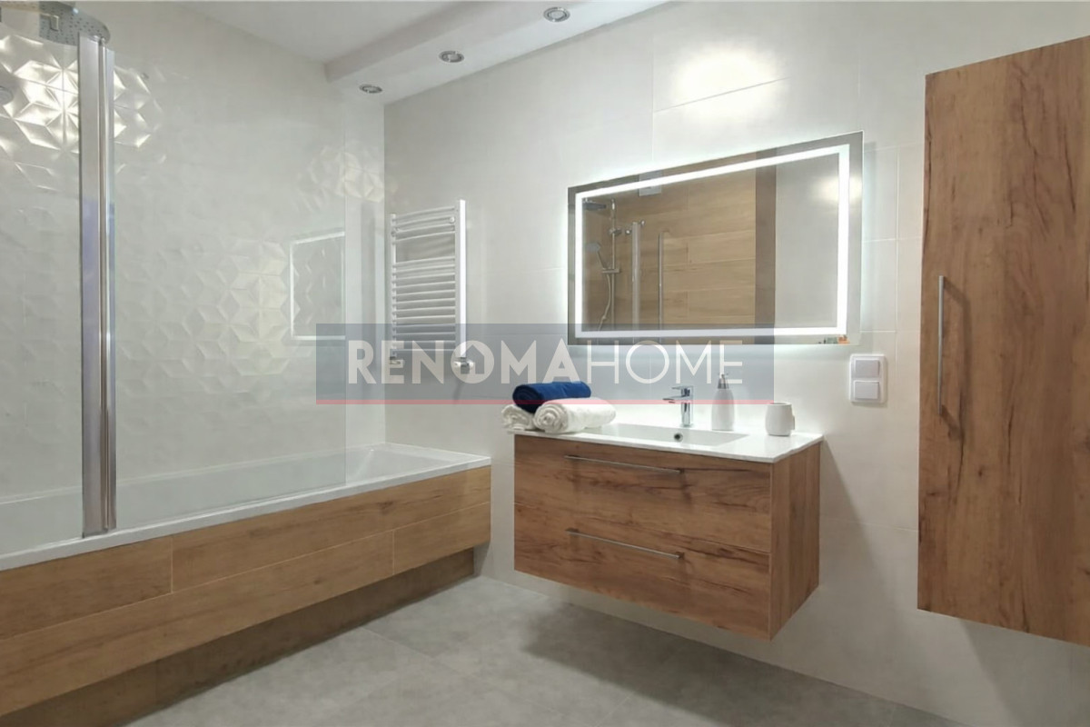 Łazienka to jasna, przestronna strefa kąpielowa z dużą wanną, kompletnym zestawem prysznicowym, zabudową, podświetlanym lustrem oraz miejscem na pralkę i suszarkę w oddzielnej konfiguracji.