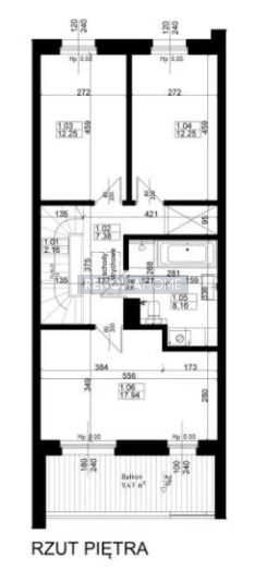 – I piętra ( trzy pokoje o powierzchniach – 12,25, 12,25 i 17,94m2; łazienka oraz hol. Na piętrze również szeroki balkon – 9,41m2).