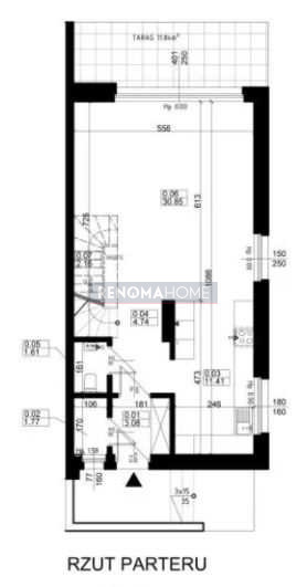 – parteru (salon o powierzchni 30,85m2, kuchnia 11,41m2, toaleta, pomieszczenie gospodarcze i hol. Z salonu wyjście na przestronny taras o powierzchni 11,84m2)