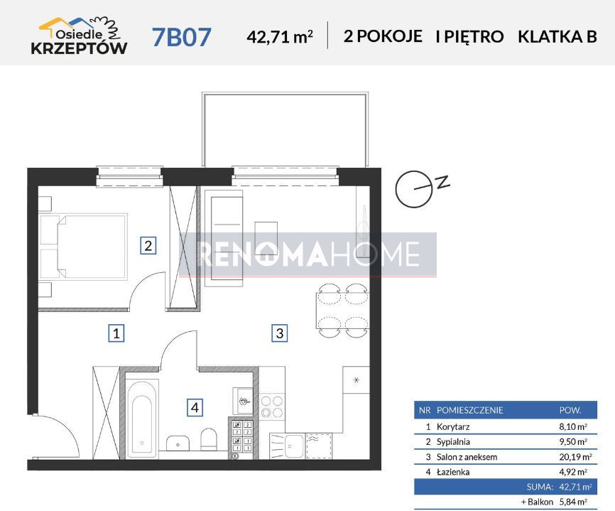 Mieszkanie o powierzchni 42,71m2 usytuowane na 1 piętrze z balkonem.