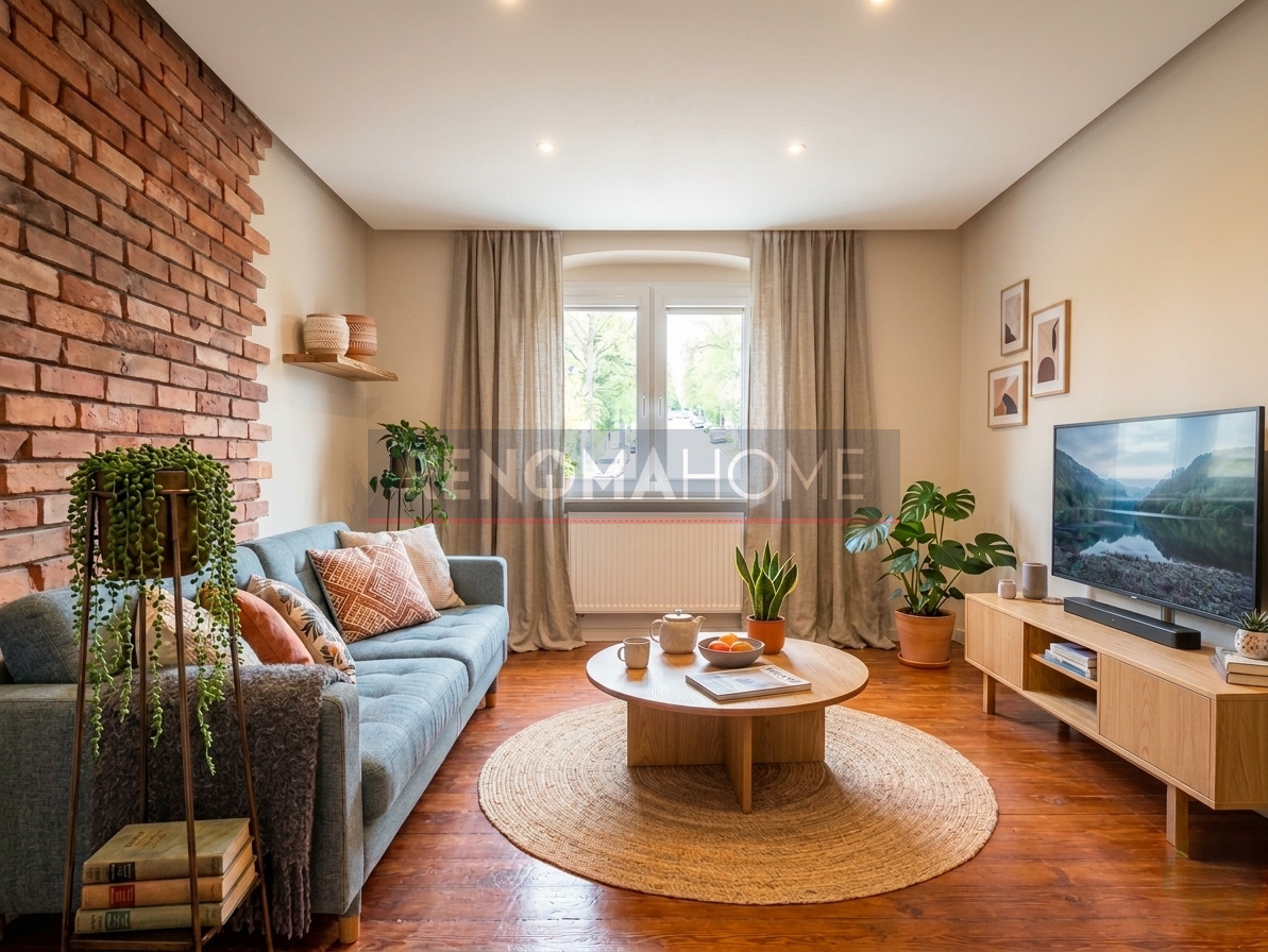 -przestronny salon z charakterystyczną ceglaną ścianą