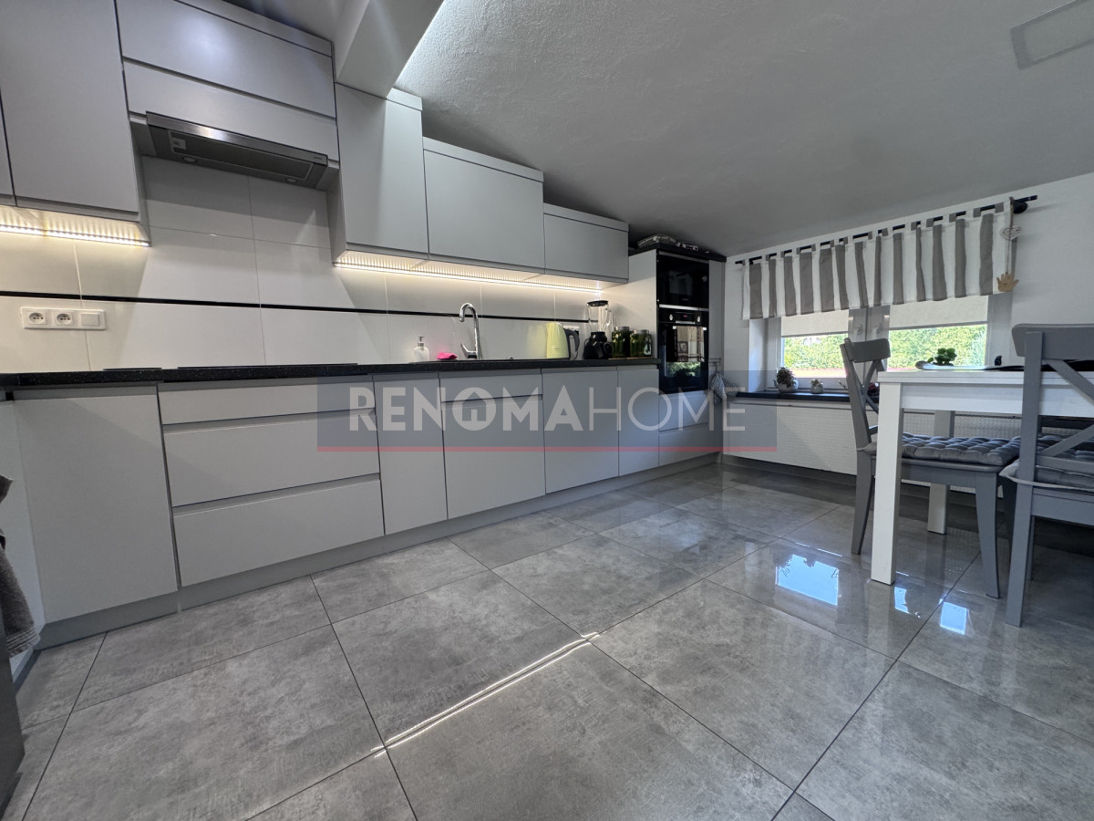 Przestronna kuchnia z częścią jadalną- jasne wnętrza z dużą ilością naturalnego światła. Kuchnia w zabudowie.