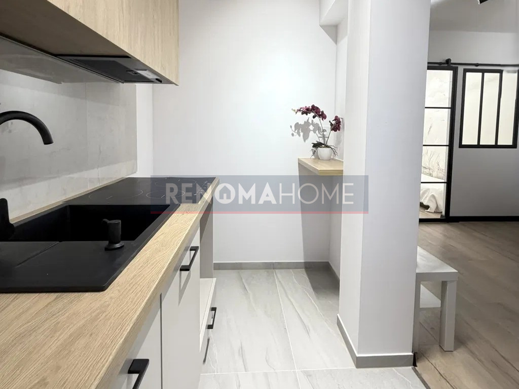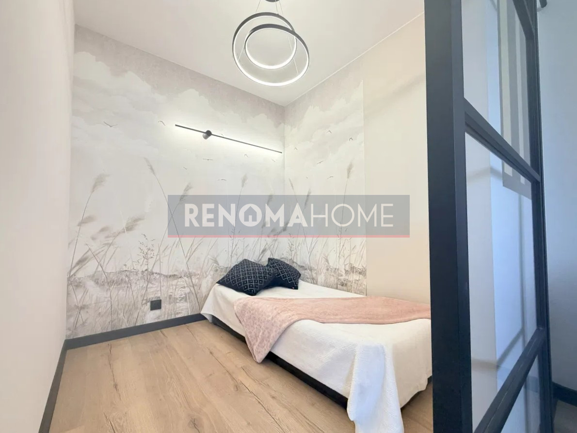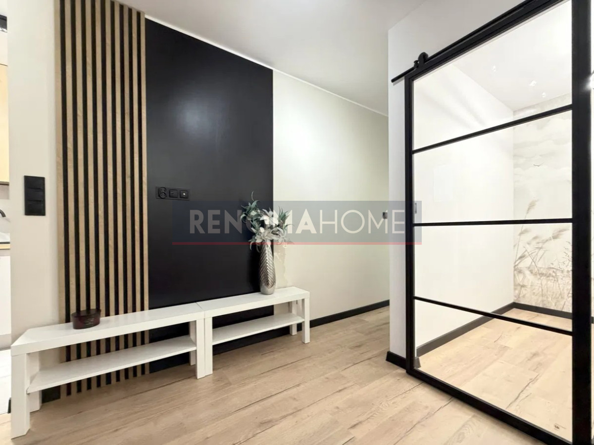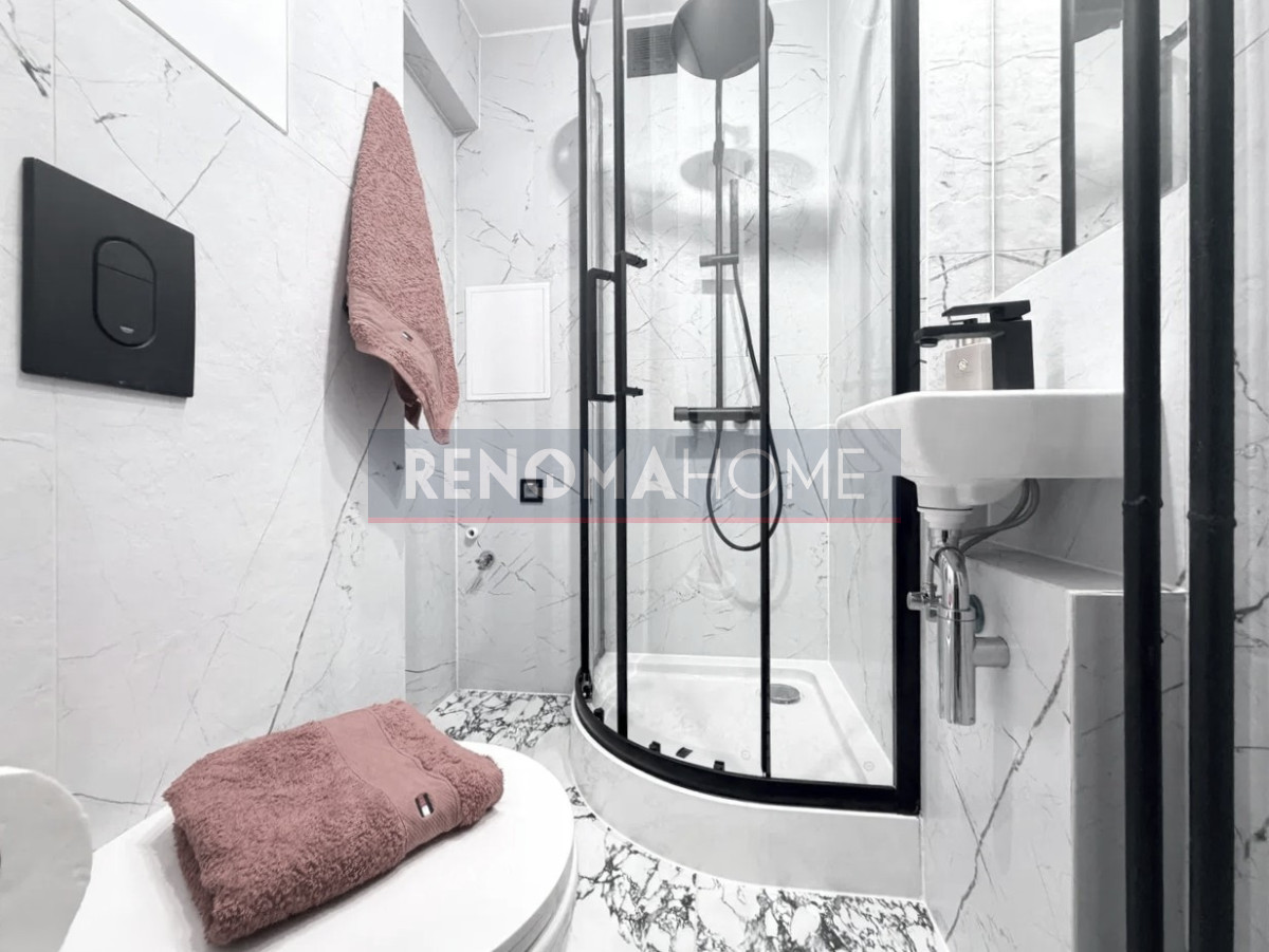 Kuchnia wyposażona jest w meble wykonane na wymiar, okap w zabudowie a łazienka zachwyca eleganckim wykończeniem i nowoczesnym designem..