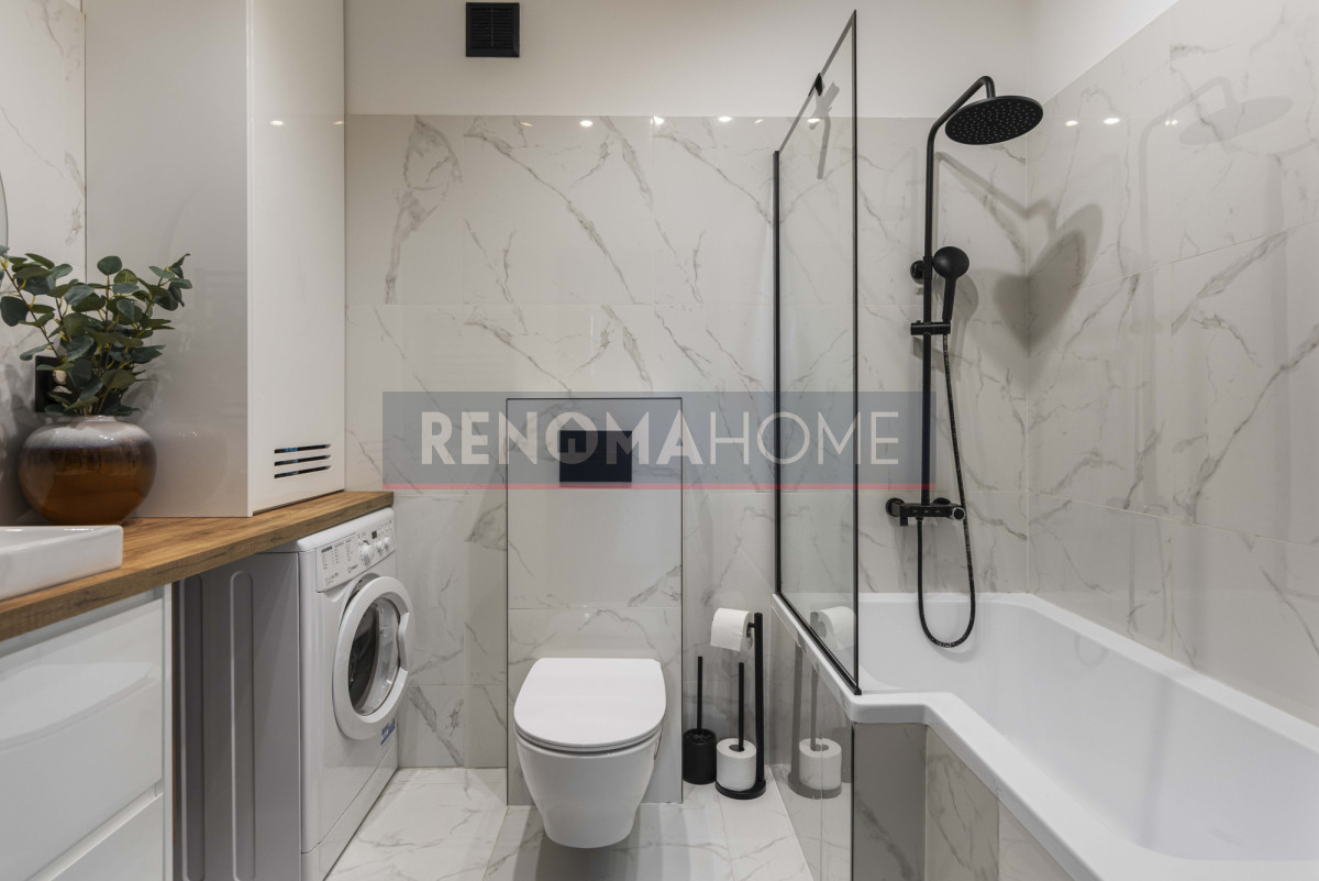 – Łazienka – z wanną, WC, umywalką oraz miejscem na pralkę.