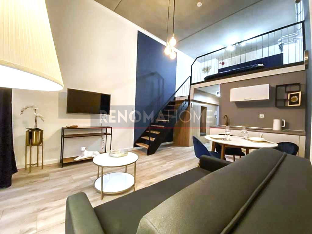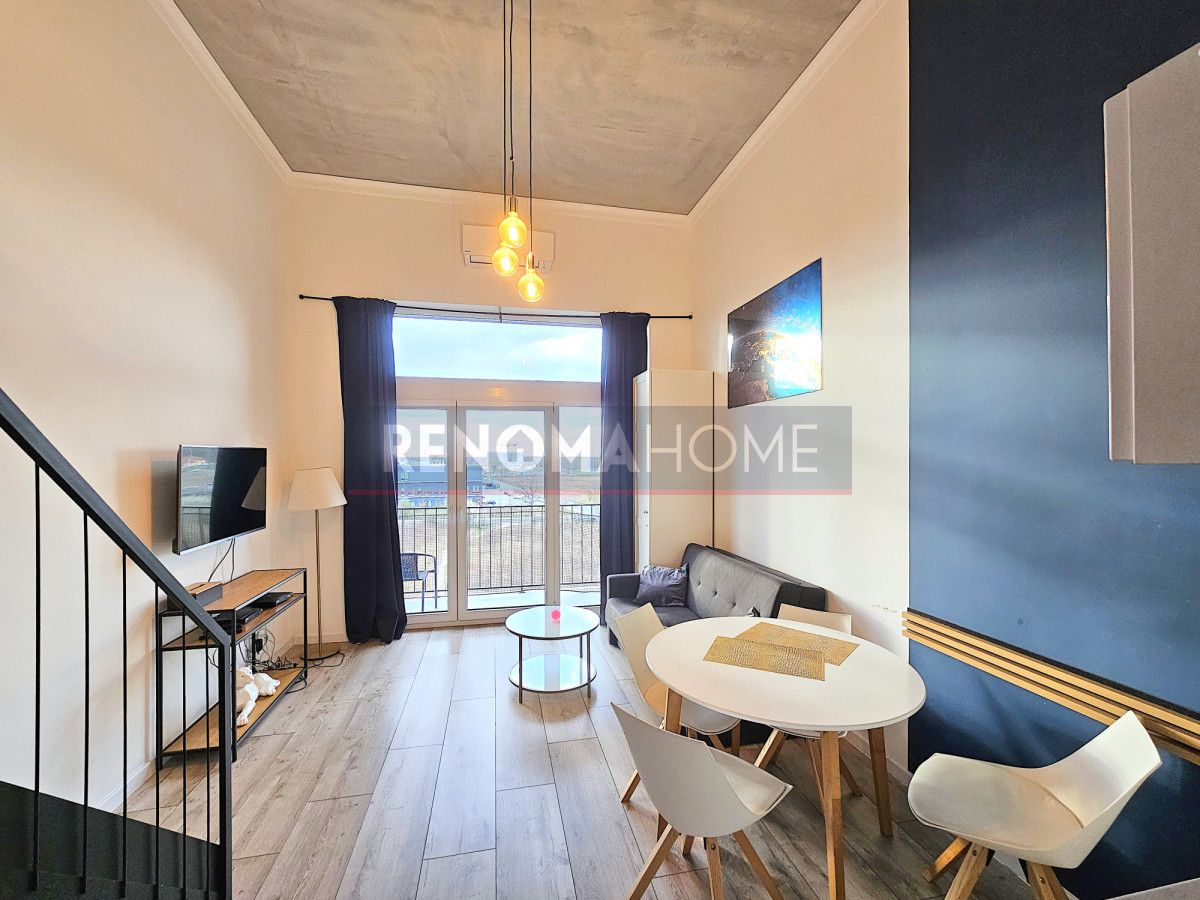 Z antresolą do spania i balkonem o pow. 8 m², w pełni umeblowany i wyposażony.
