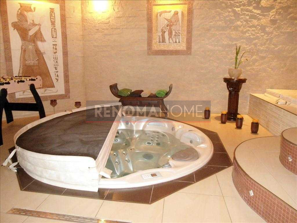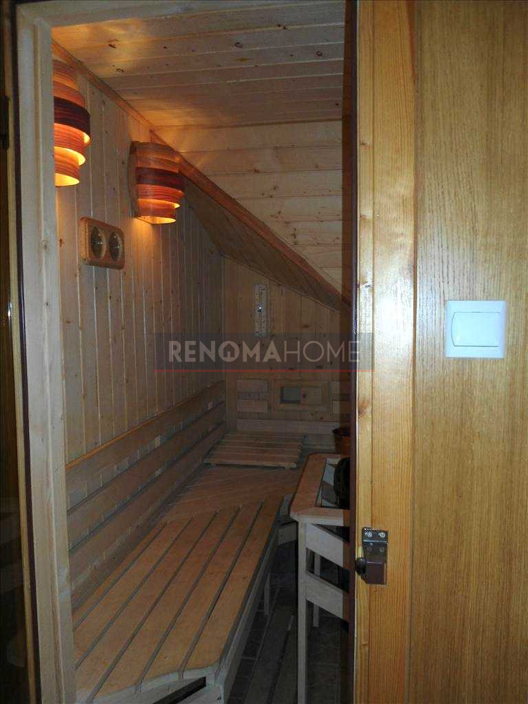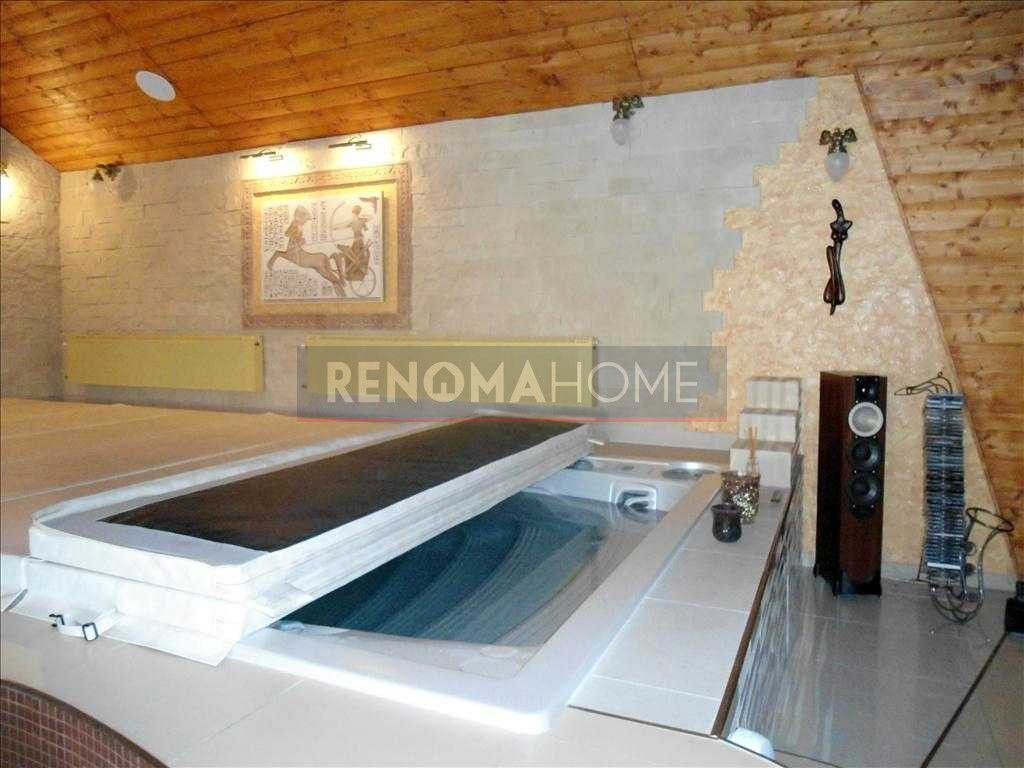 Dodatkową zaletą jest pokój kąpielowy, w którym znajduje się basen, jacuzzi oraz sauna, a także miejsce na wypoczynek z barem i zapleczem kuchennym. Całość dopełnia duży ogród z miejscem do odpoczynku, grillowania oraz kącikiem męskich spotkań przy zarybionym stawie.