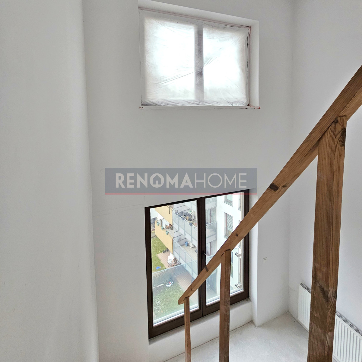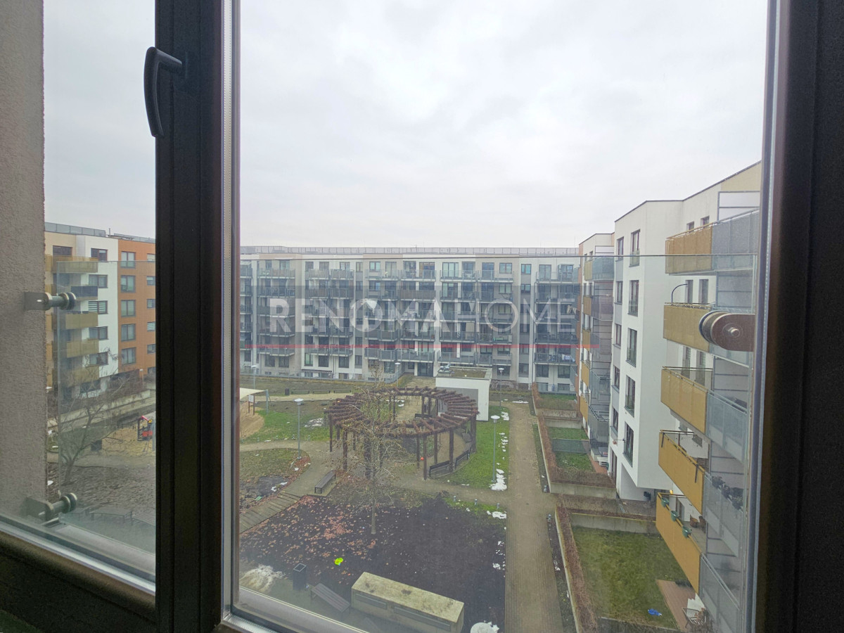 Okna mieszkania wychodzą na wewnętrzne patio.