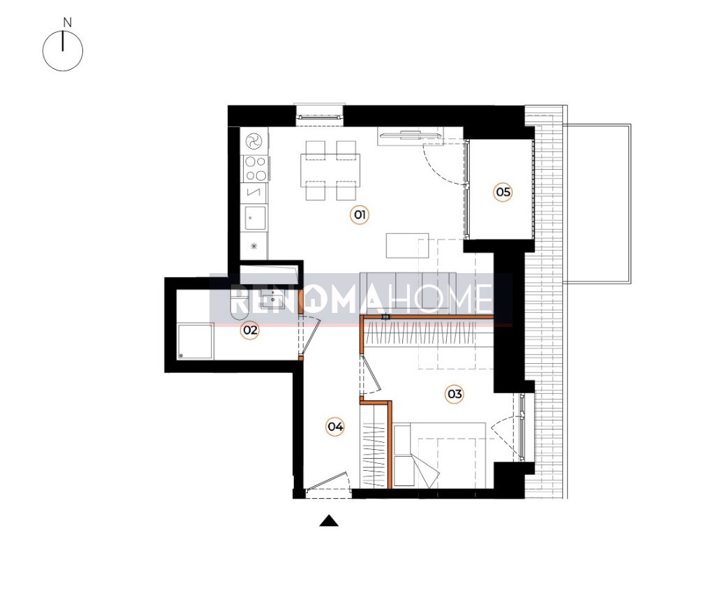 – dwustronnego salonu z funkcjonalnym aneksem kuchennym i wyjściem na loggię