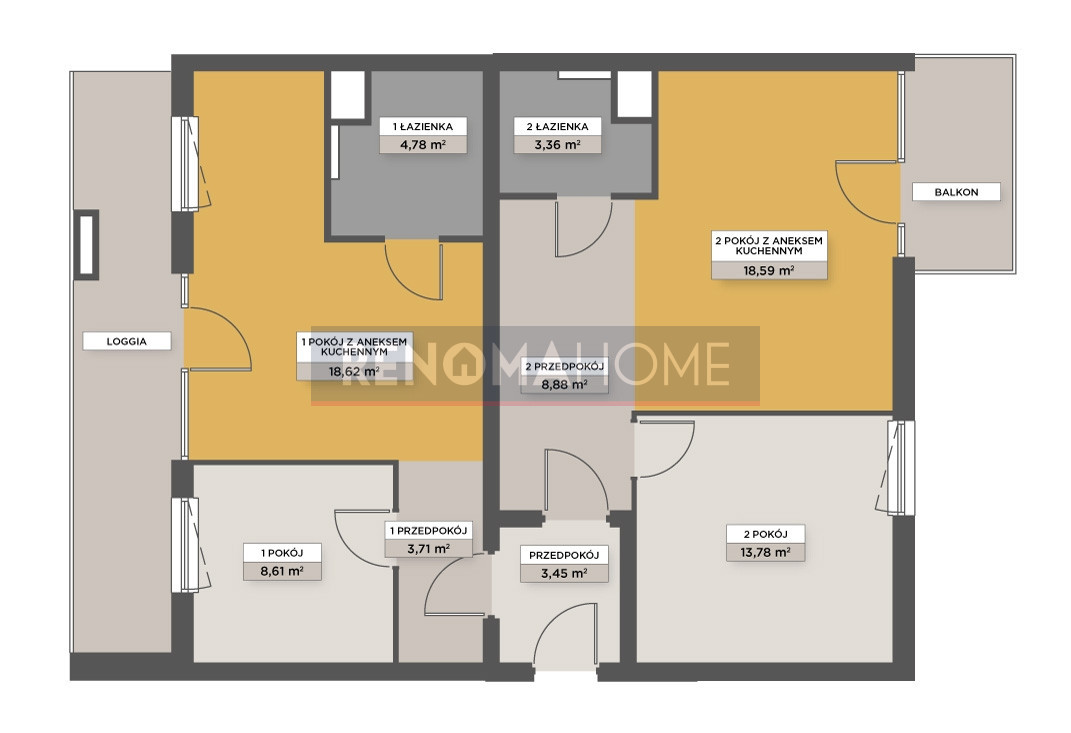 - salon z aneksem kuchennym - 18,59m²;