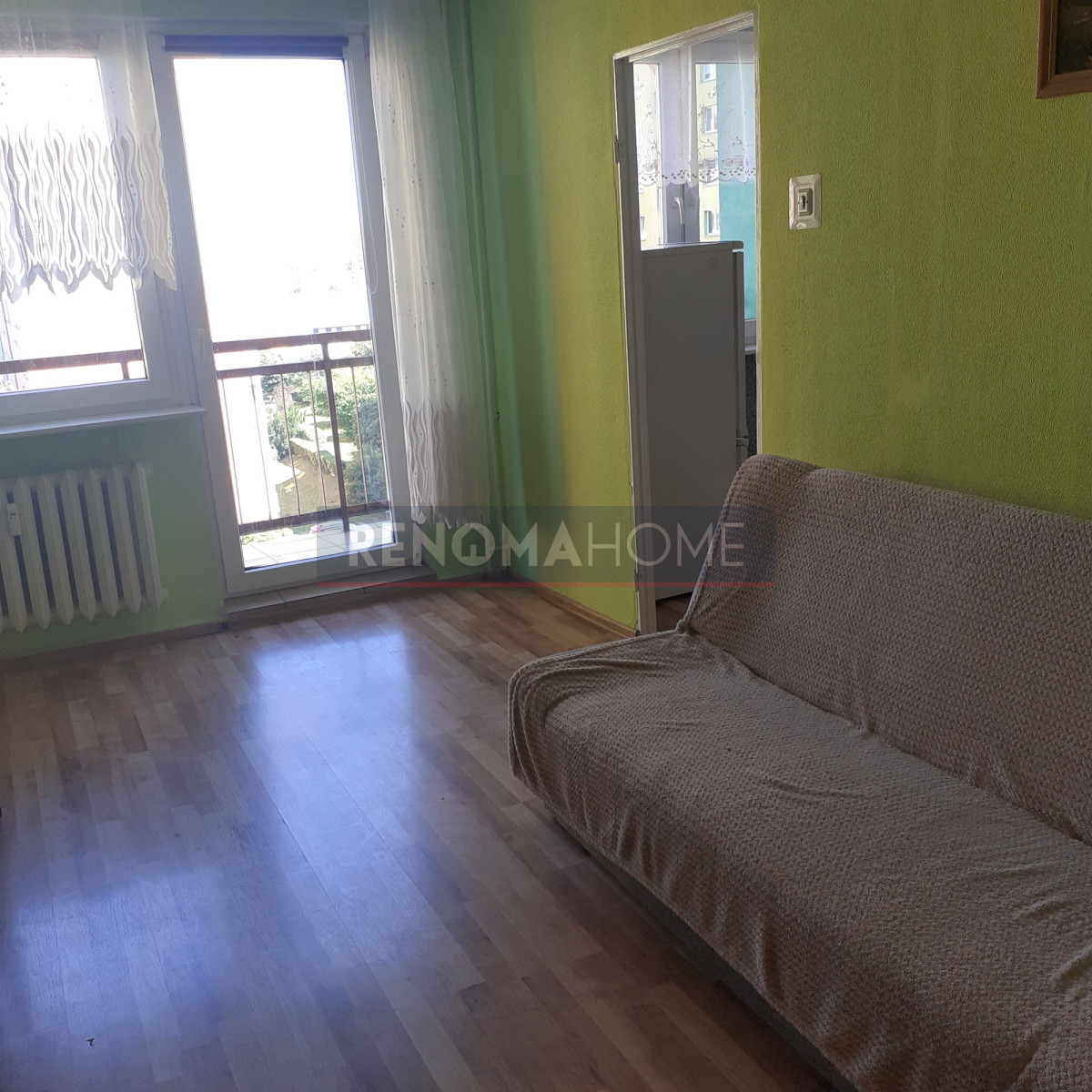 Pokój z jasną kuchnią, duży balkon.