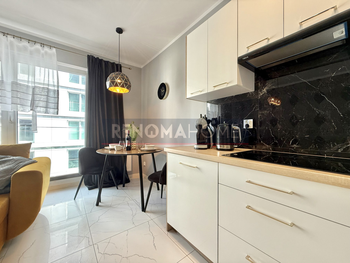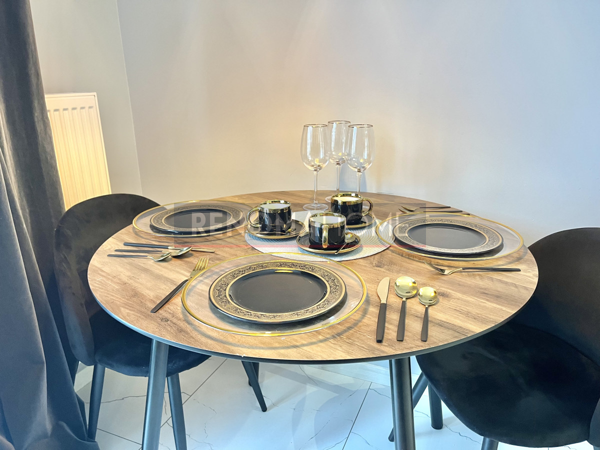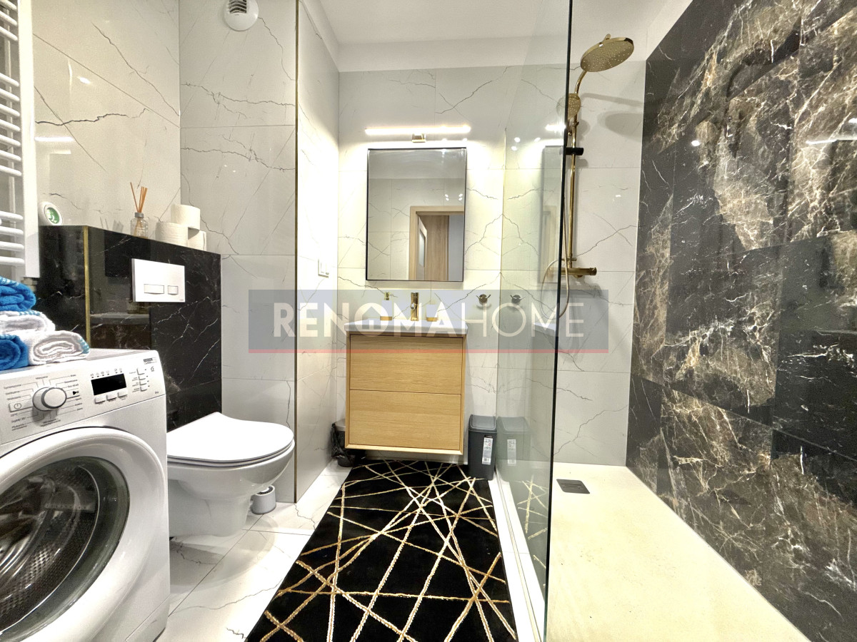 Mieszkanie jest całkowicie umeblowane oraz wyposażone we wszystkie niezbędne sprzęty, takie jak zmywarka, lodówka, pralka, piekarnik czy potężny telewizor 55 cali.