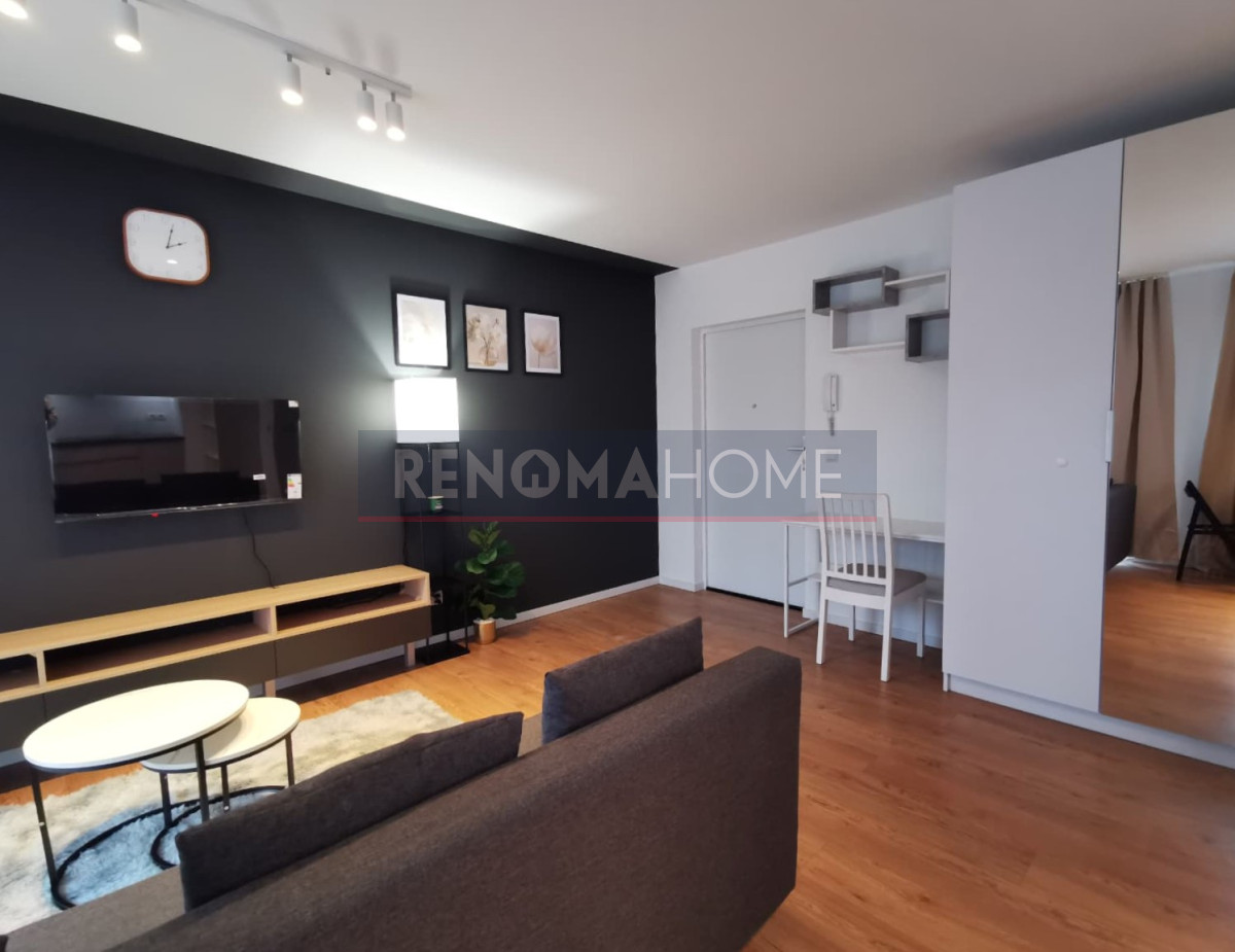 Mieszkanie umeblowane i wyposażone: rozkładana kanapa ze skrzynią na pościel, pojemna szafa z lustrem, regał, stolik kawowy, telewizor, szafka RTV, stół i krzesła, półki i lampka.