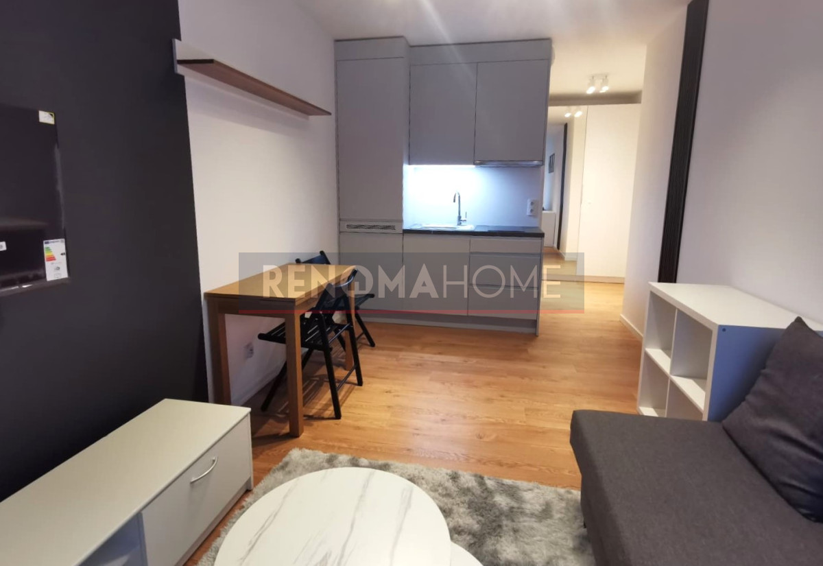 Mieszkanie umeblowane i wyposażone zgodnie z załączonymi zdjęciami: rozkładana kanapa ze skrzynią na pościel, pojemna szafa z lustrem, regał, stolik kawowy, telewizor, szafka RTV, stół i krzesła, półka i lampka.